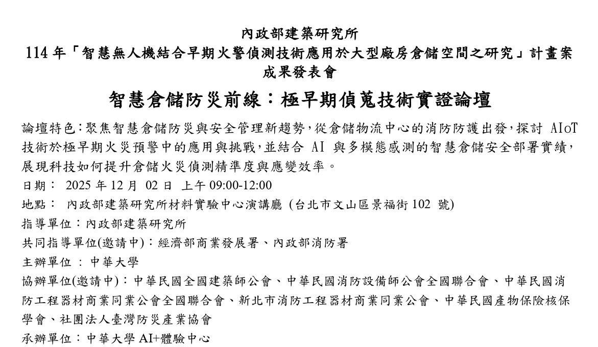 本次由 #中華大學 主辦、#內政部建築研究所 指導,並邀集產官學研重量級專家共同分享最新研究成果,聚焦 AIoT、極早期火災預警、多模態感測、智慧倉儲安全部署 等前沿技術,協助提升臺灣倉儲防災系統整體能量。協會亦受邀擔任協辦單位,共同推動智慧防災技術的實務應用。