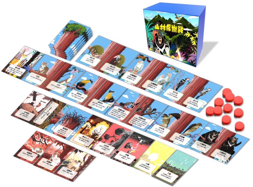 《山林保衛戰》是一款以「臺灣山林」為主題的桌上遊戲。 2-4人遊玩,8歲以上小孩大人皆可遊玩,30分鐘一回合,輕鬆學習山林保衛知識。 這是一個需要大家一起建造自己的森林的遊戲,裡面的山林動物是守護森林的戰士,隨時會面對天災(土石流、閃電、森林大火)、人為濫捕濫殺,或是互相攻防的生態食物鏈,桌遊裡面有請路殺社林德恩老師幫忙教育小冊還有卡牌美術的部分,希望可以讓小朋友在遊戲中認識山林動物,也了解他們所面臨到的困境。另外,我們也有請防災教育的專家王价巨老師協助天災的應變措施,讓小朋友(或大人)在玩遊戲之後能更加清楚的知道這些災害的風險以及可以應變的方法,歡迎加入《山林保衛戰》。 |