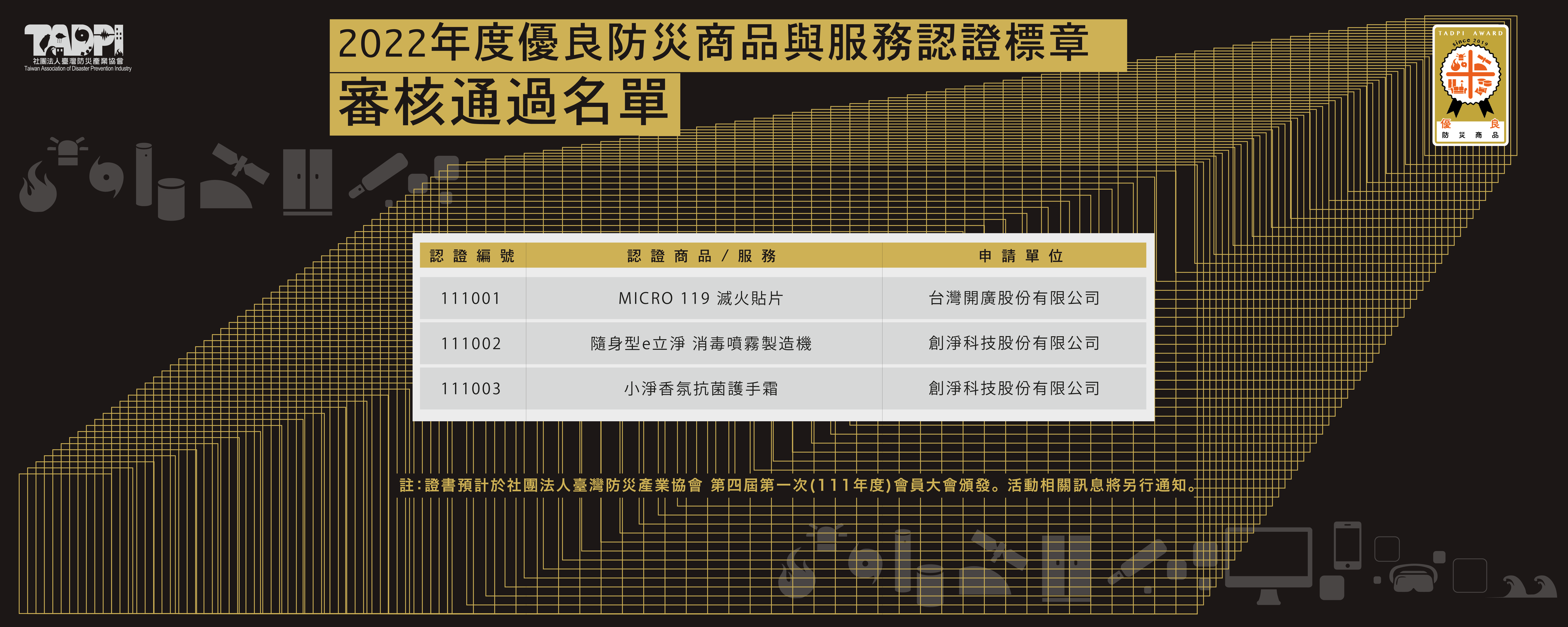提醒本次3件新通過審核之申請單位,證書預計於社團法人臺灣防災產業協會 第四屆第一次(111年度)會員大會頒發。相關活動訊息將另行通知。