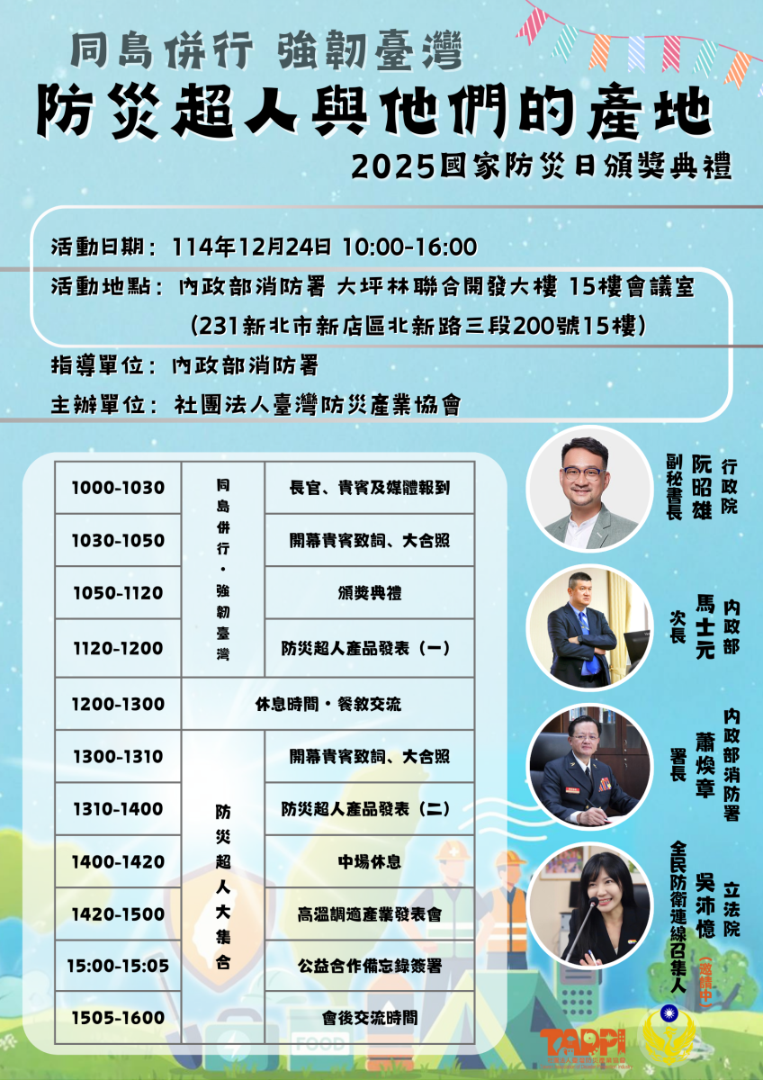 近年全球氣候極端化趨勢明顯,2025年被譽為「史上最暖年」,地震與颱風等災害頻仍,再次提醒全民防災的重要性。臺灣防災產業協會誠摯邀請各界共同關注防災新知與產業發展,並參與即將於 12月24日(星期二) 舉行的【防災超人與他們的產地】頒獎典禮,一同見證年度防災創新成果與跨界合作行動。