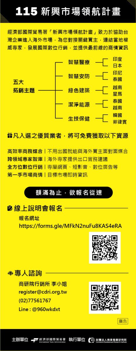 想要讓品牌躍上國際舞台嗎?由經濟部國際貿易署主辦的「115年度新興市場領航計畫」報名開跑啦!