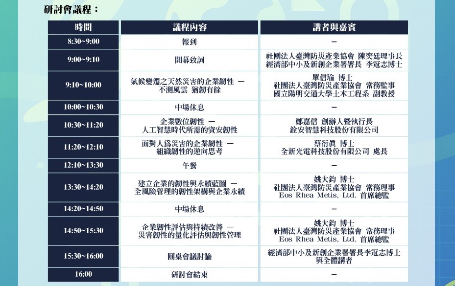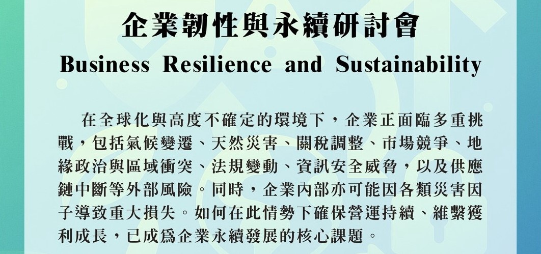 本研討會由協會主辦,邀請產官學研各界專家齊聚,分享從氣候災害、數位資安到全風險管理的最新趨勢與實務案例,協助企業打造具回復力與競爭力的永續藍圖。