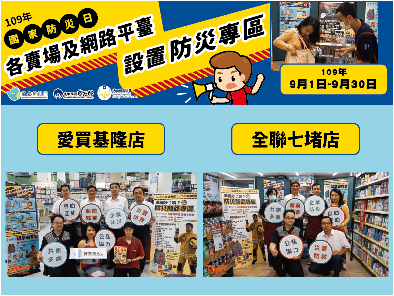 2020九月防災月 防災商品專區 今年9月21日國家防災日即將來臨,政府特別在9月份推動各大賣場及網路購物平臺設置防災用品及食物專區,讓民眾方便準備居家防災用品及食物,輕鬆便利做好防災準備。 目前已完成「防災專區」設置的賣場及網路平臺業者: 實體賣場:#大潤發、#特力屋 網路平臺:大潤發、露天拍賣、momo購物網、東森購物、PChome線上購物 ▲ 全聯七堵店防災商品專區 ▲ 愛買基隆店店員介紹防災商品專區 #防災商品 #民生救助 #自助 #互助 #防災儲備 #平時做準備災時不狼狽